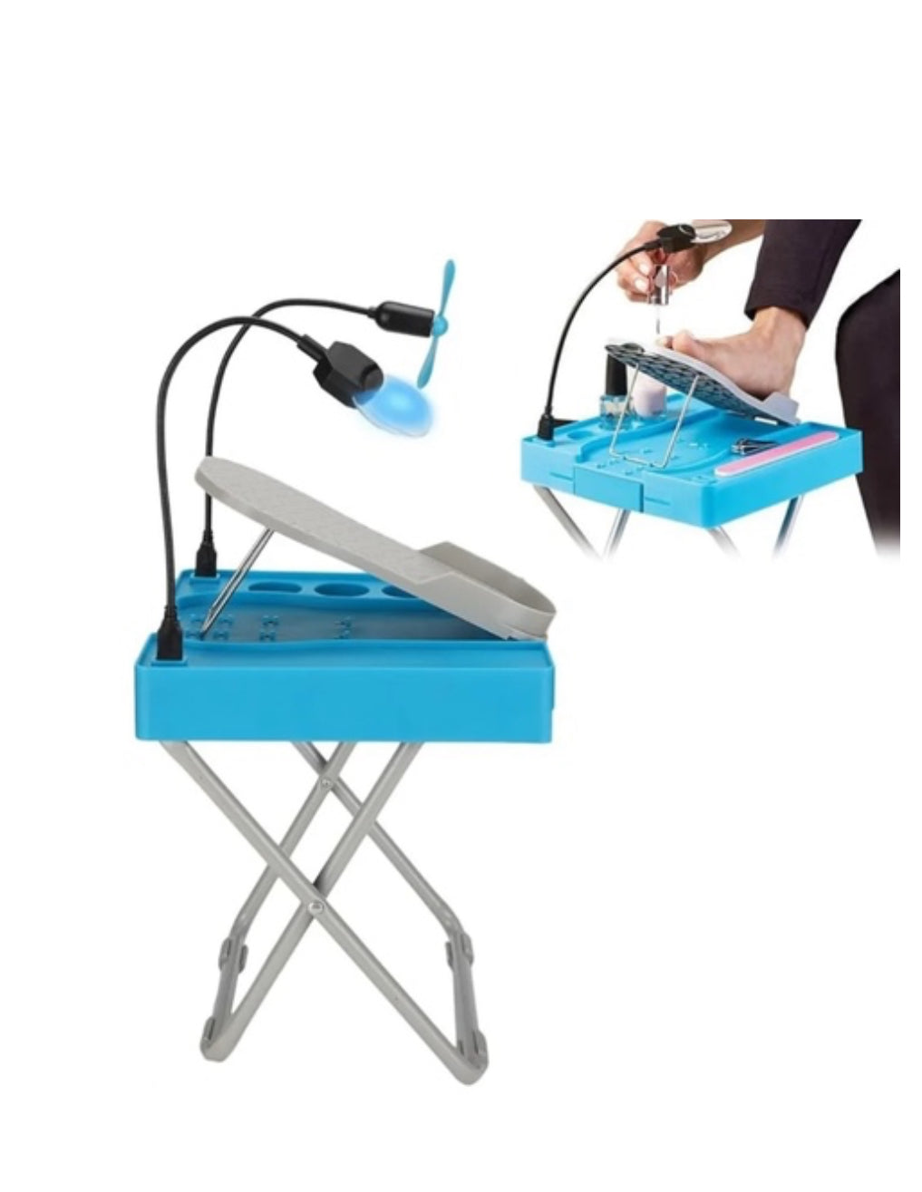مزود بحوامل خاصة لزجاجات طلاء الأظافر، درج مدمج لأدوات العناية، وإمكانية طي الكرسي بسهولة لتخزينه في أي مكان بالمنزل
