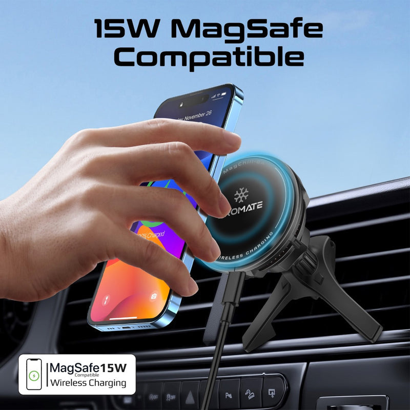 استمتع بأقصى درجات الراحة والأمان على الطريق مع حامل الشحن للسيارة المتوافق مع MagSafe بقوة 15 واط. هذه الابتكار الثوري يقدم نظام التبريد شبه الموصل الأول في العالم، المصمم خصيصًا لمواجهة ارتفاع درجات الحرارة في البيئات ذات الحرارة العالية. استفد من التبريد السريع للهواتف المحمولة حتى 15 درجة أثناء الشحن، مما يخفف بشكل فعال من المشاكل الشائعة مثل الحماية من الحرارة العالية أو فشل الشحن في بيئات السيارات الحارة.